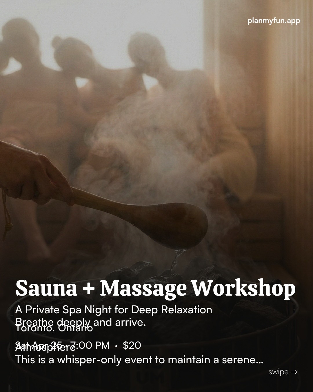 A private spa night featuring sauna, cold plunge, massage workshop, and complimentary RMT massages with Dan Sing. This is whisper-only event where clothing is optional but comfort is mandatory.