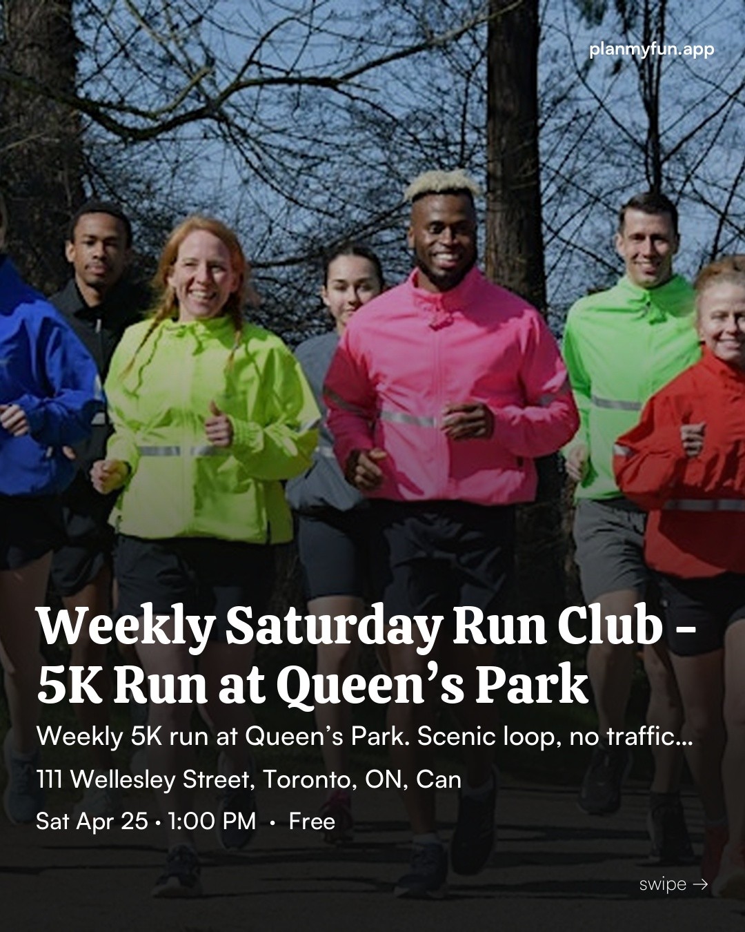 A scenic 5K loop around Queen's Park with no traffic lights and all paces welcome. The loop format means everyone stays together regardless of speed, and the park setting keeps it interesting.