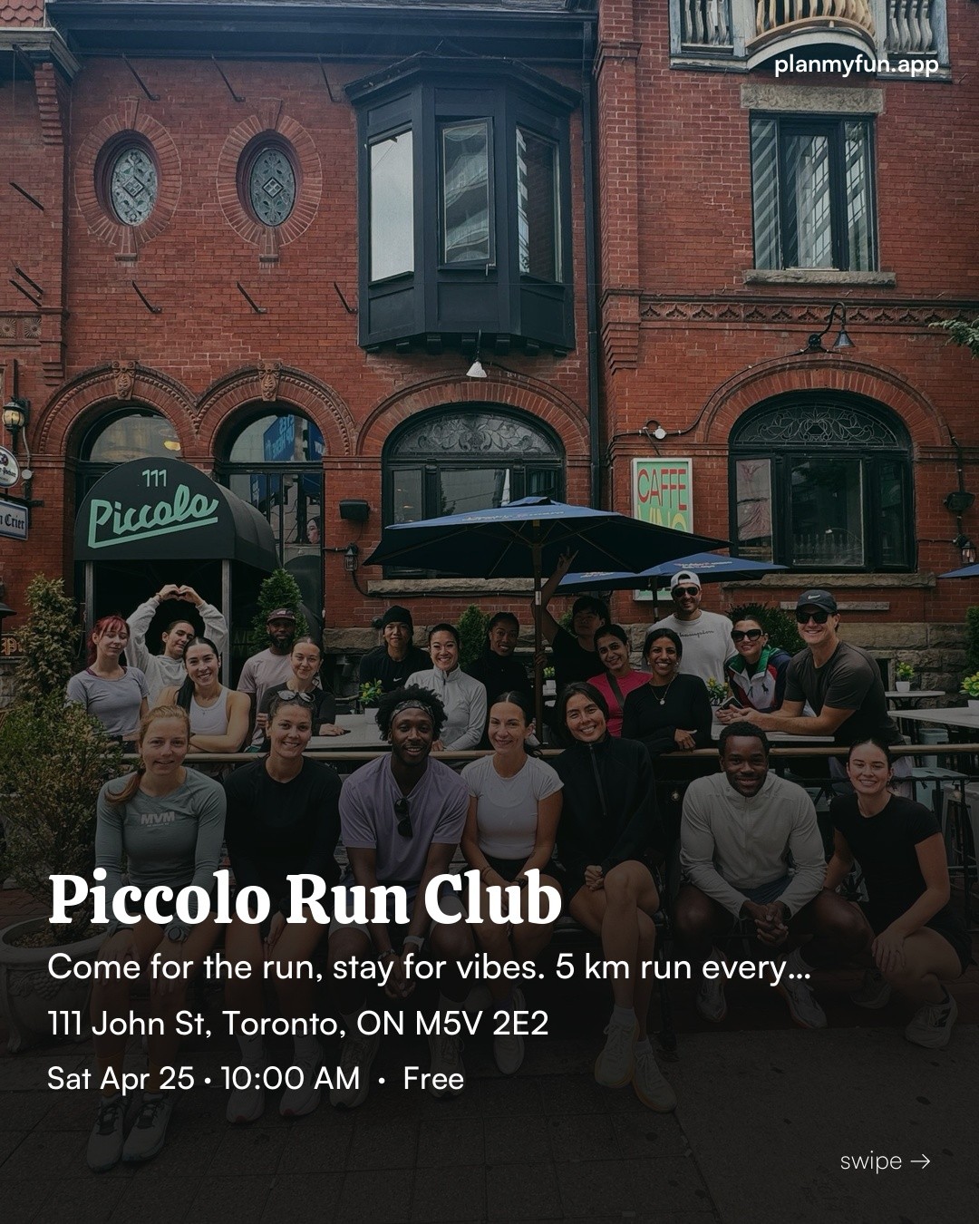 Come for the run, stay for vibes. A 5km run every Saturday at 10am starting from Piccolo Cafe. The consistency and location make this a reliable weekend ritual.